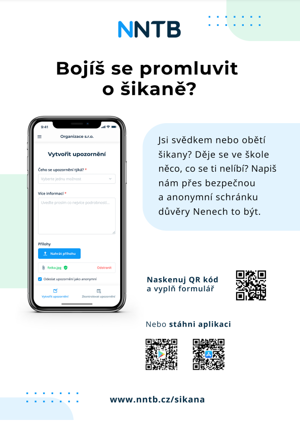 Naše škola se zapojila do platformy Nenech to být (NNTB). NNTB slouží jako anonymní online schránka důvěry, a pomáhá tak žákům a jejich rodičům s řešením různých problémů a situací ve škole. Skrze NNTB můžete upozornit např. na šikanu mezi žáky, kyberšikanu, užívání návykových látek, sebepoškozování, domácí násilí apod.